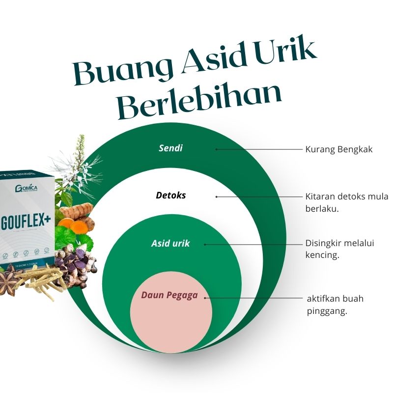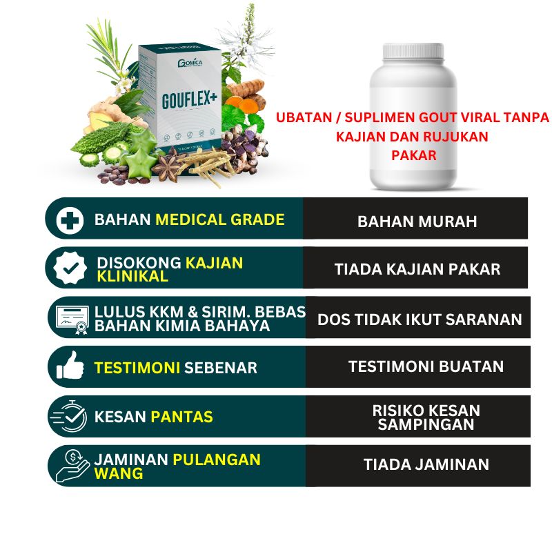 Sebelum ni asyik bergantung pada ubat tahan sakit. Tapi lepas cuba GOUFLEX+, sakit datang makin jarang. Sekarang dah tak perlu ambil ubat farmasi, badan pun rasa lebih ringan.