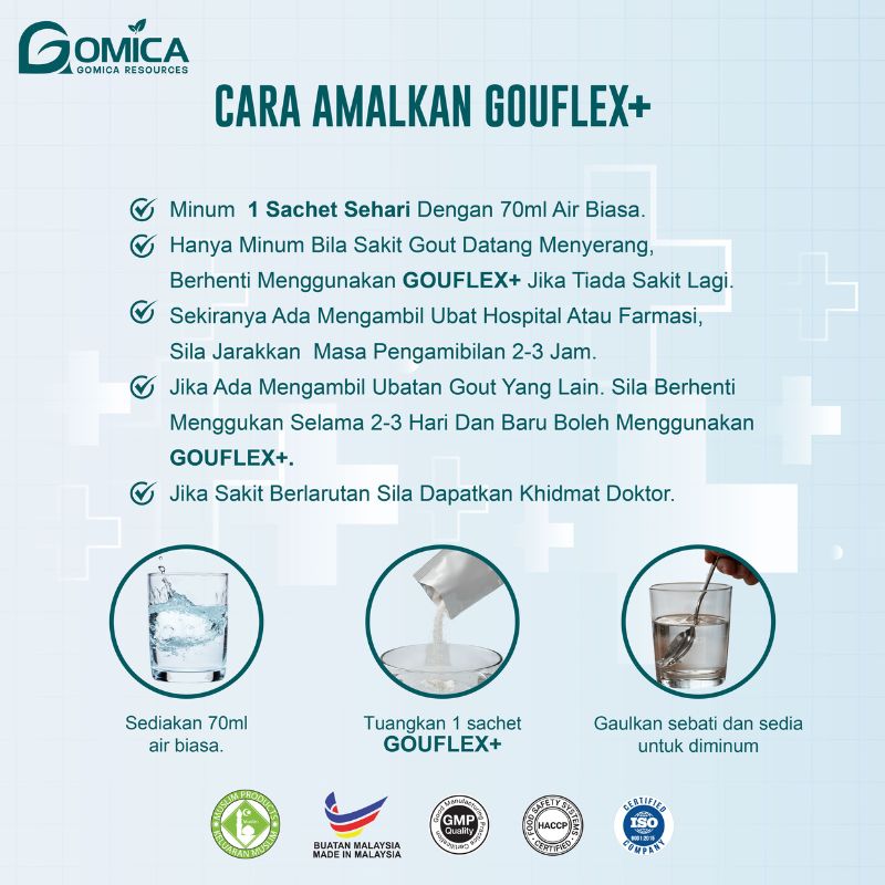 GOUFLEX+ diformulasi di Malaysia, diproses di fasiliti bertaraf GMP & HACCP, dan diformulasi mengikut keperluan kelulusan KKM.